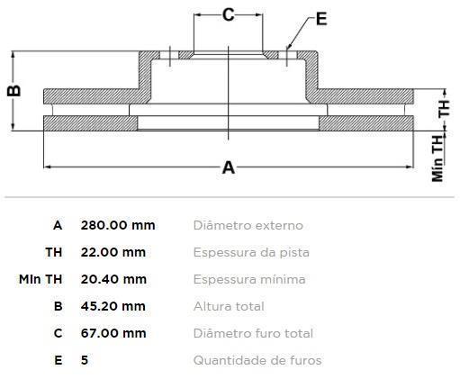 Observação | Tipo de disco de freio = Ventilado internamente Local de montagem = Eixo dianteiro Ø = 280 mm Espessura do disco de freio = 22 mm Espessura mín. = 20,4 mm Ø do cubo da roda = 67 mm Altura = 45,2 mm Disposição/número de orifícios = 6/5 Superfície = revestimento parcial |